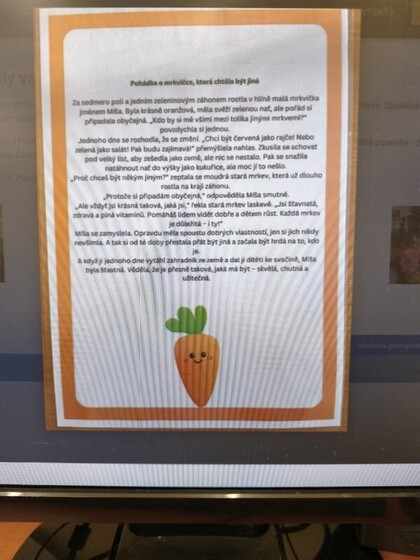 Žáci se v lekcích dozvěděli o historii, původu, odrůdách mrkve. Počítali s mrkví, hráli pohádku o mrkvi, uvařili si mrkvovou polévku. Nakonec si zazpívali písničku o mrkvi a ve foto koutku si udělali fotku.