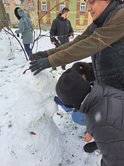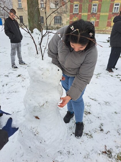Žáci 2. RS se snažili ze sněhu uválet klasickým způsobem 3 koule, které poskládali na sebe. Největší sněhová koule na zemi má tvořit nohy sněhuláka, prostřední představuje trup a vrchní, nejmenší, pak hlavu. Na prostřední kouli se připevňují dvě menší koule jako ruce, do kterých se vkládá koště nebo větve.