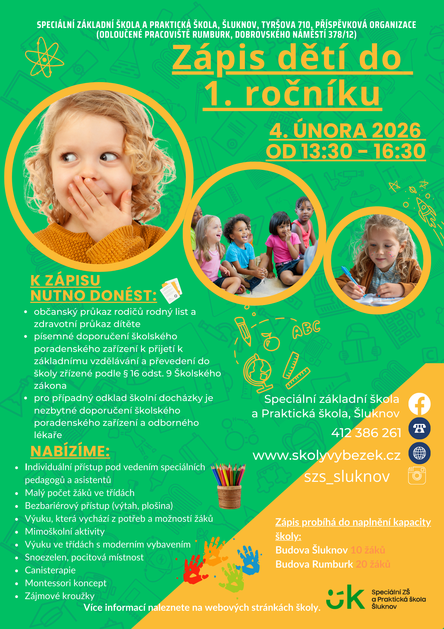 Zápis probíhá do naplnění kapacity školy:Budova Šluknov: 10 žákůBudova Rumburk: 20 žáků
